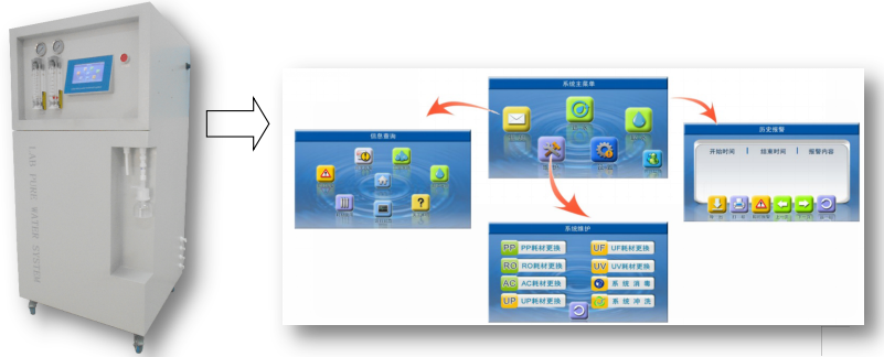 Ø 完善的RO純水和超純水造水、系統(tǒng)取水、系統(tǒng)循環(huán)和消毒等管理功能。
