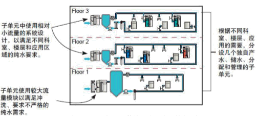 相對于單一循環(huán)的整體純水系統(tǒng),其水質針對性更好、相對消耗更低、管理維護適用性更強、容易滿足不同使用區(qū)域的要求。兼容了集中供水和使用點獨立供水兩種策略的優(yōu)點。