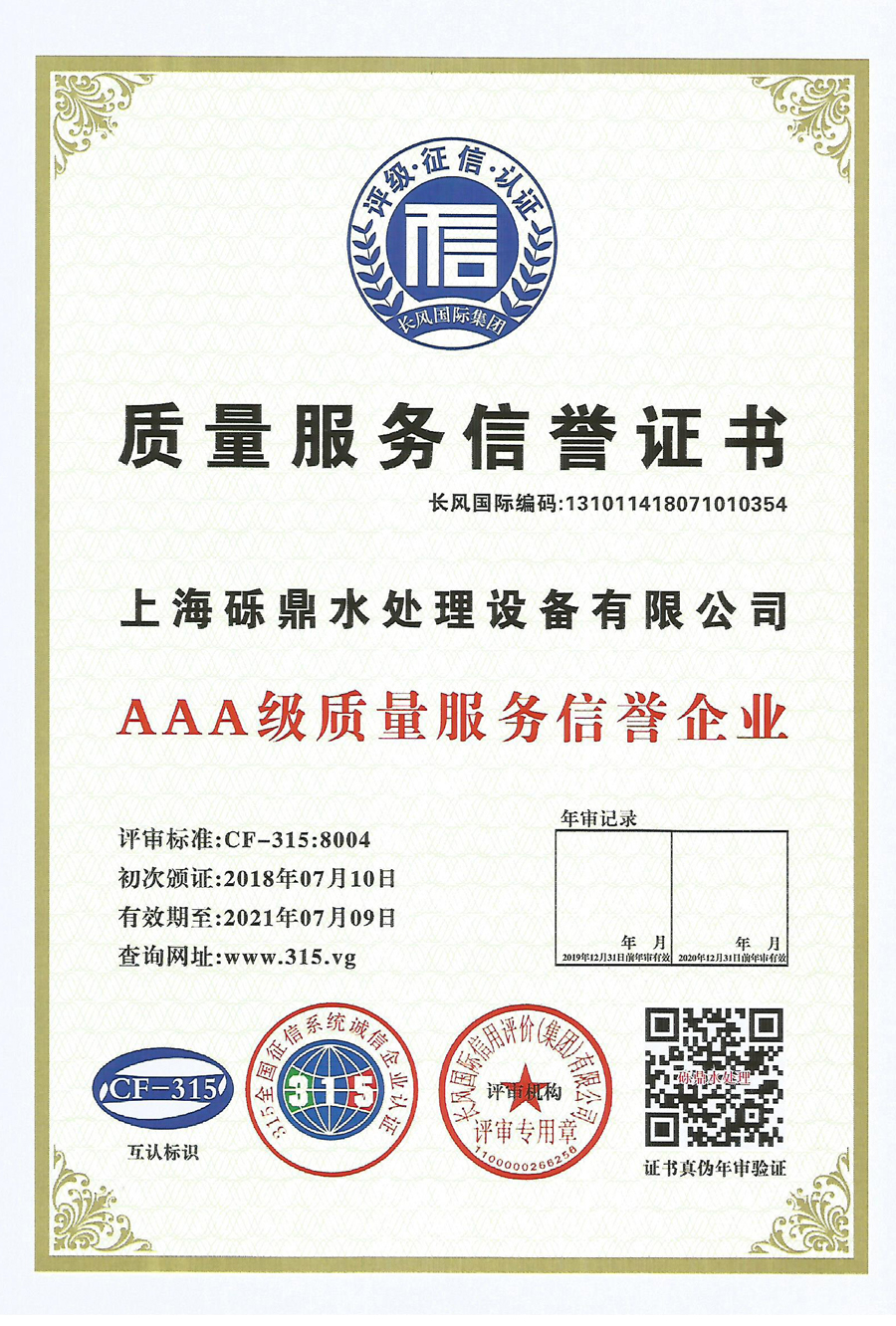 質(zhì)量服務信譽證書